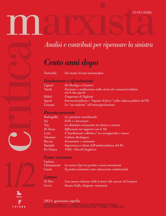 Cari lettori e cari abbonati di Critica Marxista, come ogni anno, ma quest’anno con un accento particolare, vi ricordo che la “nuova serie” di Critica Marxista – che conta quasi trent’anni di attività, da quando divenne, dopo la fine del Pci, una testata del tutto autonoma e indipendente, volta alla ricerca e alla elaborazione di un pensiero critico e all’analisi della realtà – vive e può vivere solo grazie al sostegno degli abbonamenti. Il contributo della redazione e degli autori e autrici è completamente volontario, così come l’impegno di chi cerca di promuovere la diffusione e la conoscenza della rivista, che esce e viene distribuita, in formato cartaceo e elettronico, grazie al prezioso lavoro della casa editrice della Cgil. Quest’anno c’è una ragione in più per abbonarsi e sostenere Critica Marxista. Il prossimo numero, il primo del 2021, sarà un fascicolo speciale, e interamente dedicato al centenario della fondazione del Pci, ricco di contributi di carattere storico e analitico, che oltre a esaminare i tratti che abbiamo considerato più interessanti della vita del vecchio partito offre numerosi spunti di riflessione sui problemi e le sfide aperte oggi, sempre con quell’intenzione di “ripensare la sinistra” che è scritta nella nostra testata.Il numero speciale sul centenario del Pci conterrà tra gli altri contributi di Aldo Agosti, Fulvia Bandoli, Francesco Barbagallo, Maria Luisa Boccia, Rinalda Carati, Franca Chiaromonte, Piero Di Siena, Alexander Höbel, Alberto Leiss, Guido Liguori, Fiamma Lussana, Claudio Natoli, Mario Sai, Aldo Tortorella, Chiara Valentini, Vincenzo Vita.Vi chiediamo quindi di rinnovare l’abbonamento, e di proporre ad amiche e amici, compagne e compagni di farlo, senza escludere l’idea di un regalo in vista delle festività di fine anno.